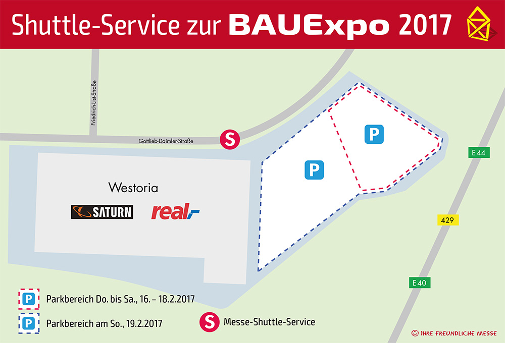 Für eine unbeschwerte und einfache Anfahrt zur BAUExpo sorgt ein extra eingerichteter Shuttle-Service. Zwischen dem real-Markt im Industriegebiet Gießen-West und den Hessenhallen werden täglich ab 9:30 Uhr Busse pendeln. Das eigene Auto kann man mit freundlicher Genehmigung auf dem Parkplatz des real-Marktes, Gottlieb-Daimler-Straße 27, abstellen - von Donnerstag bis Samstag im hinteren Teil, am Sonntag auf dem gesamten Areal (siehe Parkplatzplan). Etwa im 15-Minuten-Takt pendeln am Donnerstag und Freitag (16. und 17.2.17) Kleinbusse von Lahn-City-Car, am Samstag und Sonntag (18. und 19.2.17) fährt ein Stadtbus von MIT.BUS / SWG. Der gesamte Shuttle-Service ist für die Messebesucher kostenfrei.
